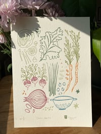 Varied open edition, lino cut design hand printed onto thick cotton paper.